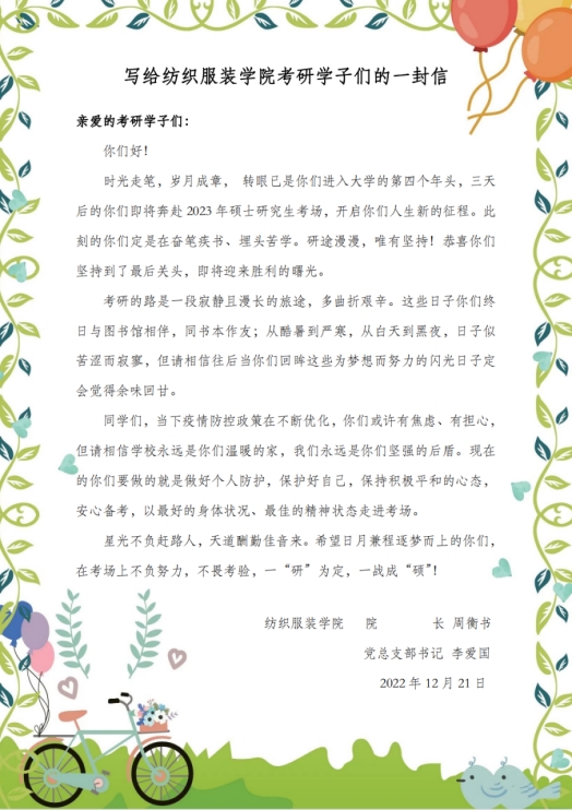 公司主要领导代表全院教职工深情寄语考研学子,叮嘱员工做好个人防护,劳逸结合,做好考前准备、消除焦虑、缓解紧张的情绪,拿出必胜的决心和勇气,最佳的精神状态走进考场。