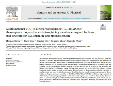 近日,纺织工程教研室程浩南老师在多功能纳米纺织材料研究领域取得新进展,研究成果以“Multifunctional Ti3C2Tx MXene/nanospheres/Ti3C2Tx MXene/ thermoplastic polyurethane electrospinning membrane inspired by bean pod structure for EMI shielding and pressure sensing”为题发表在国际期刊《Sensors and Actuators: A. Physical》上(DOI: 10.1016/j.sna.2023.114226),该期刊为SCI收录期刊(2022年影响因子4.291),是Elsevier旗下一本专注于传感器前沿研究的期刊。程浩南老师为该论文第一作者和共同通讯作者,402永利集团为第一单位和通讯单位。