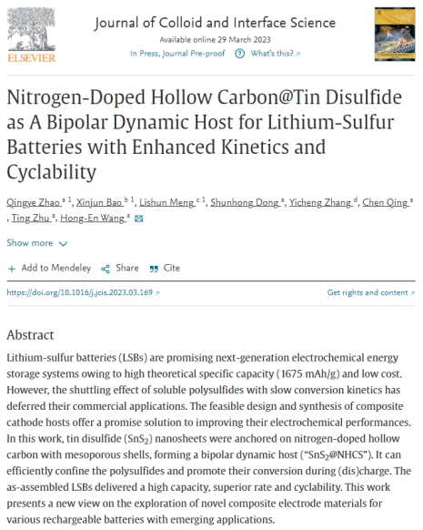 近日,纺织工程教研室包新军博士与云南师范大学王洪恩教授合作,在能源材料领域取得新进展,研究成果以“Nitrogen Doped Hollow Carbon@Tin Disulfide as A Bipolar Dynamic Host for Lithium-Sulfur Batteries with EnhancedKinetics and Cyclability”为题发表在国际期刊《Journal of Colloid and Interface Science》上(DOI:10.1016/j.jcis.2023.03.169)(JCRQ1,中科院SCI一区Top期刊,IF=9.965)。包新军博士为该论文共同第一作者,402永利集团为第二完成单位,云南师范大学王洪恩教授为论文通讯作者,云南师范大学为论文第一完成单位。
