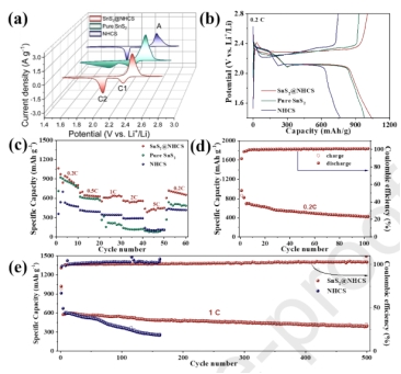 锂硫电池因其高理论比容量(1675mAh/g)和成本低廉,是极具发展前景的下一代电化学能源存储系统。然而,可溶性多硫化物缓慢的转化动力学引发的“穿梭效应”阻碍了其进一步规模化的商业应用。正极材料的复合化可行设计和合成为提高其电化学性能提供了可行的解决方案。在这项工作中,借助化学法将二硫化锡(SnS2)纳米片固定在氮掺杂的空心多孔碳载体(NHCS)上,形成双极性动态宿主(“SnS2@NHCS”)。这种复合结构能有效地抑制多硫化物在电解液中的溶解和穿梭,加速其在充放电过程中的转化。一方面,NHCS有利于提高正极的导电性,其中空结构利于单质硫的负载,缓解充放电中正极体积膨胀,大量的介孔孔道有利于电解液的渗透。另一方面,锂化的SnS2(由于Li共插入)能通过化学相互作用吸附和促进可溶性多硫化物的转化,从而有效抑制穿梭效应。组装后的锂硫电池展现出高容量、优越的速率和循环性能。这项工作为探索各种可充电电池的新型复合电极材料提供了新的思路。
