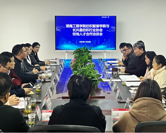 首先,李爱国对长兴县纺织行业协会一行的到来表示热烈欢迎,并介绍了公司在团队建设、人才培养、科学研究、服务社会和文化传承等方面的成果和贡献。他表示,公司目前正处在高质量发展的关键时期,希望未来双方能在校企、校地人才培养方面进一步加强交流合作。接着,姚建忠详细介绍了长兴县概况、经济产业发展、人才需求及人才引进相关政策,希望双方能持续加强合作交流,并表示热烈欢迎同学们到长兴县实习、就业、创业。随后,姚锄强对长兴县纺织行业发展状况及整体布局进行了详细介绍,各企业负责人介绍了企业对人才的需求情况。双方深入沟通交流后,签署了校地行业人才智力项目战略合作协议。