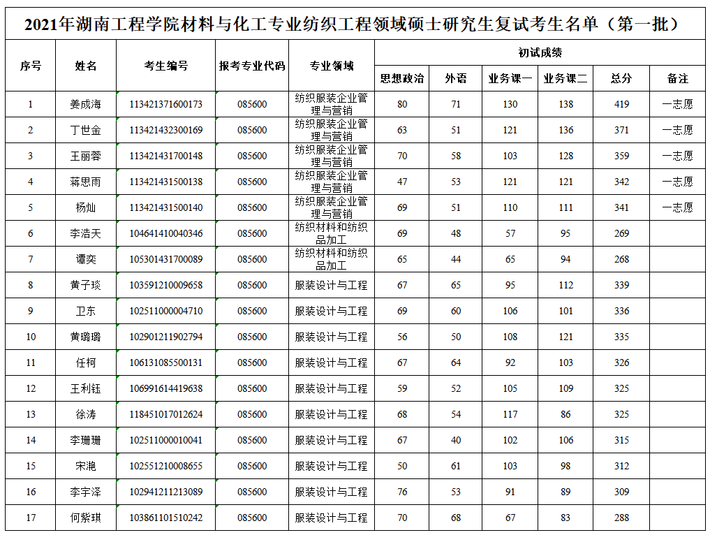2021年402永利集团材料与化工专业纺织工程领域硕士研究生复试考生名单(第一批)