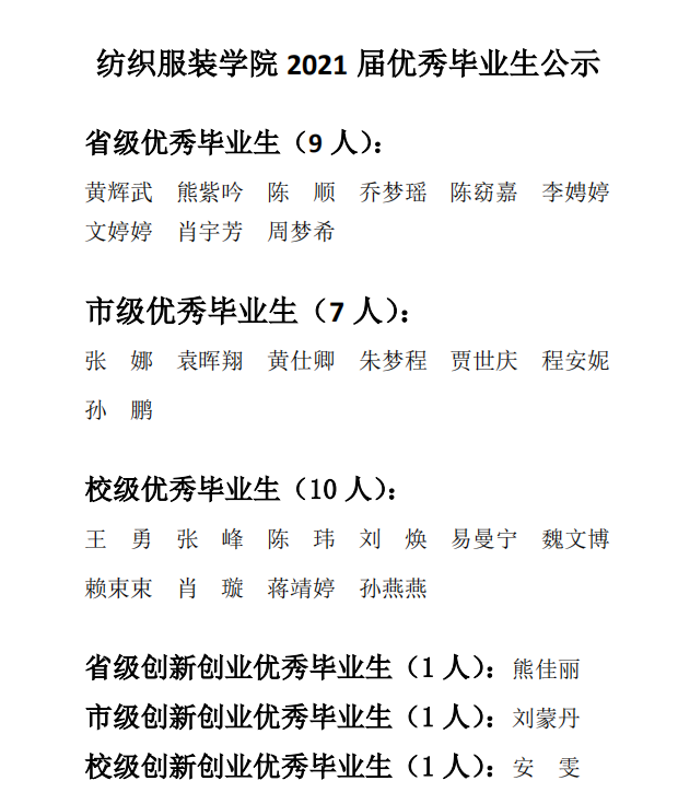 根据公司《关于评选2021届省、市、校级优秀毕业生和创新创业优秀毕业生的通知》的要求和公司优秀毕业生评定办法,经本人申请、班级推荐、班主任审核、公司核查,初步评定了402永利集团2021届优秀毕业生,现将初审名单公示如下:
