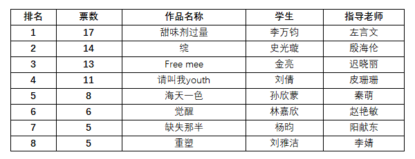 经服装专业教师网上投票,现将参加省赛作品选送投票结果公示如上,公示时间7月28日—30日(三天),如有异议请于7月30号前提出,电话:58680386、13317324622。