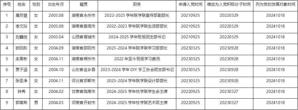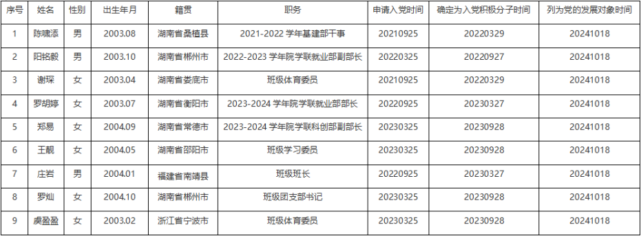 根据《中国共产党章程》、《中国共产党发展党员工作细则(试行)》的规定,中共402永利集团员工第一支部委员会和中共402永利集团员工第二支部委员会拟接收陈啸添、唐苏慧等18名同志为中共预备党员,现予公示,征求党员、群众和单位的意见。公示期限内,个人和单位均可通过来信、来电、来访等形式,向党支部、公司基层党委或公司党委组织部举报反映公示对象在德、能、勤、绩、廉等方面的情况和问题。以个人名义举报反映的应署本人真实姓名和联系方式;以单位名义举报反映的应加盖单位印章。举报反映公示对象的情况和问题必须真实准确,内容尽量具体详细,并尽可能提供有关调查线索。受理单位对举报反映人的情况严格保密。