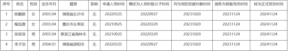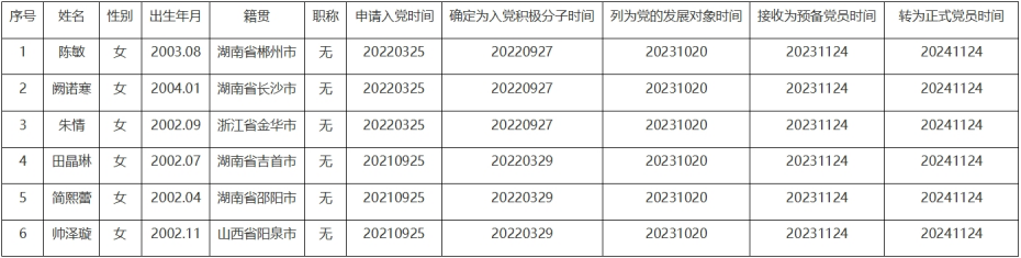 根据《中国共产党章程》、《中国共产党发展党员工作细则(试行)》的规定,中共402永利集团员工第一支部委员会和中共402永利集团员工第二支部委员会接收陈靓银、陈敏等10名同志转正为中共正式党员,现予公示,征求党员、群众和单位的意见。公示期限内,个人和单位均可通过来信、来电、来访等形式,向党支部、公司基层党委或公司党委组织部举报反映公示对象在德、能、勤、绩、廉等方面的情况和问题。以个人名义举报反映的应署本人真实姓名和联系方式;以单位名义举报反映的应加盖单位印章。举报反映公示对象的情况和问题必须真实准确,内容尽量具体详细,并尽可能提供有关调查线索。受理单位对举报反映人的情况严格保密。