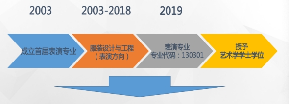 公司于2003年成立首届服装表演专业,在2003年——2018年这期间服装表演隶属于服装设计与工程下的一个专业方向,于2018年申报表演专业,2019年正式获批表演专业招生。