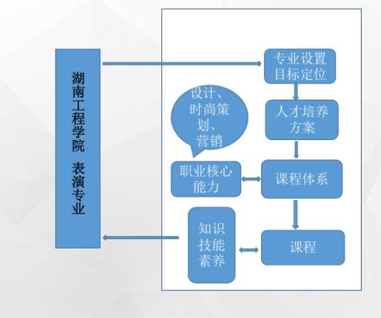 表演专业毕业生核心职业能力:表演基础、时尚策划、营销。以员工核心职业能力培养为中心,在理论课程设置上,通识基础教育课程、学科基础课程、专业课程、创新创业能力课程;在知识模块上,包含能力素质、设计能力、时尚审美与策划能力、营销能力课程。按照内容由简单到复杂,能力由弱到强的思路,实践教学循序渐进,将实践能力培养划分为“基本技能层”、“综合应用能力与初步设计能力层”和“实践与创新能力层”三个层次。