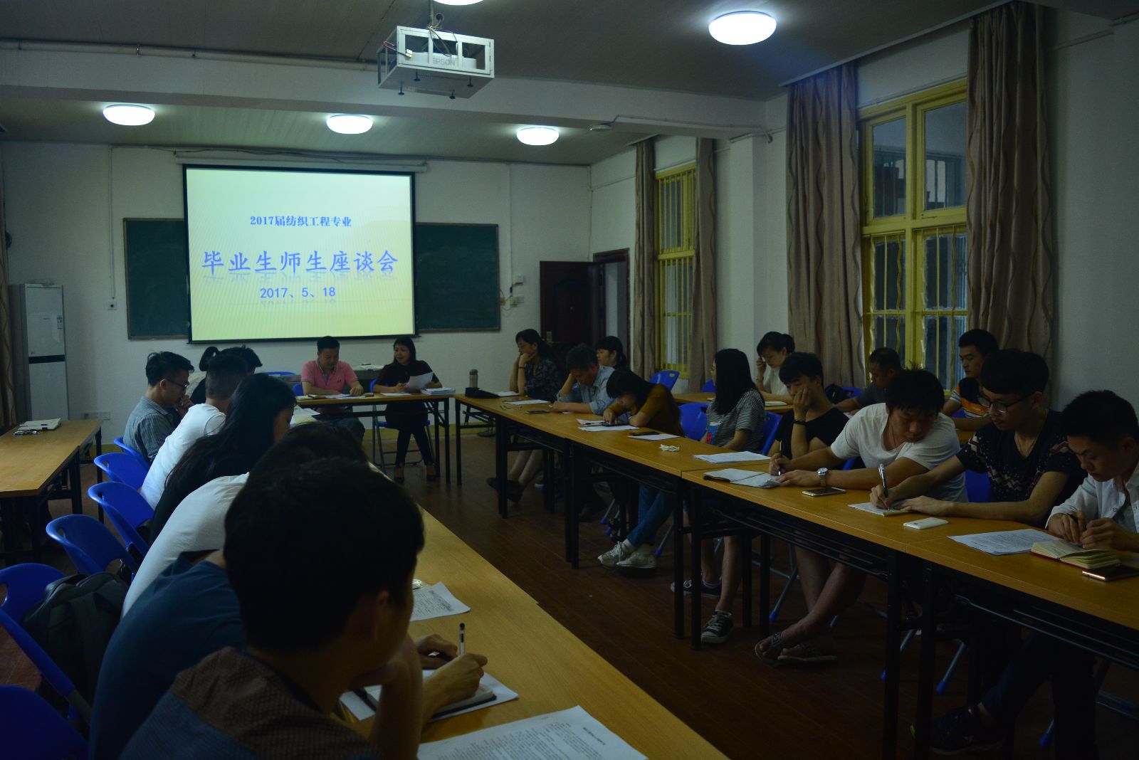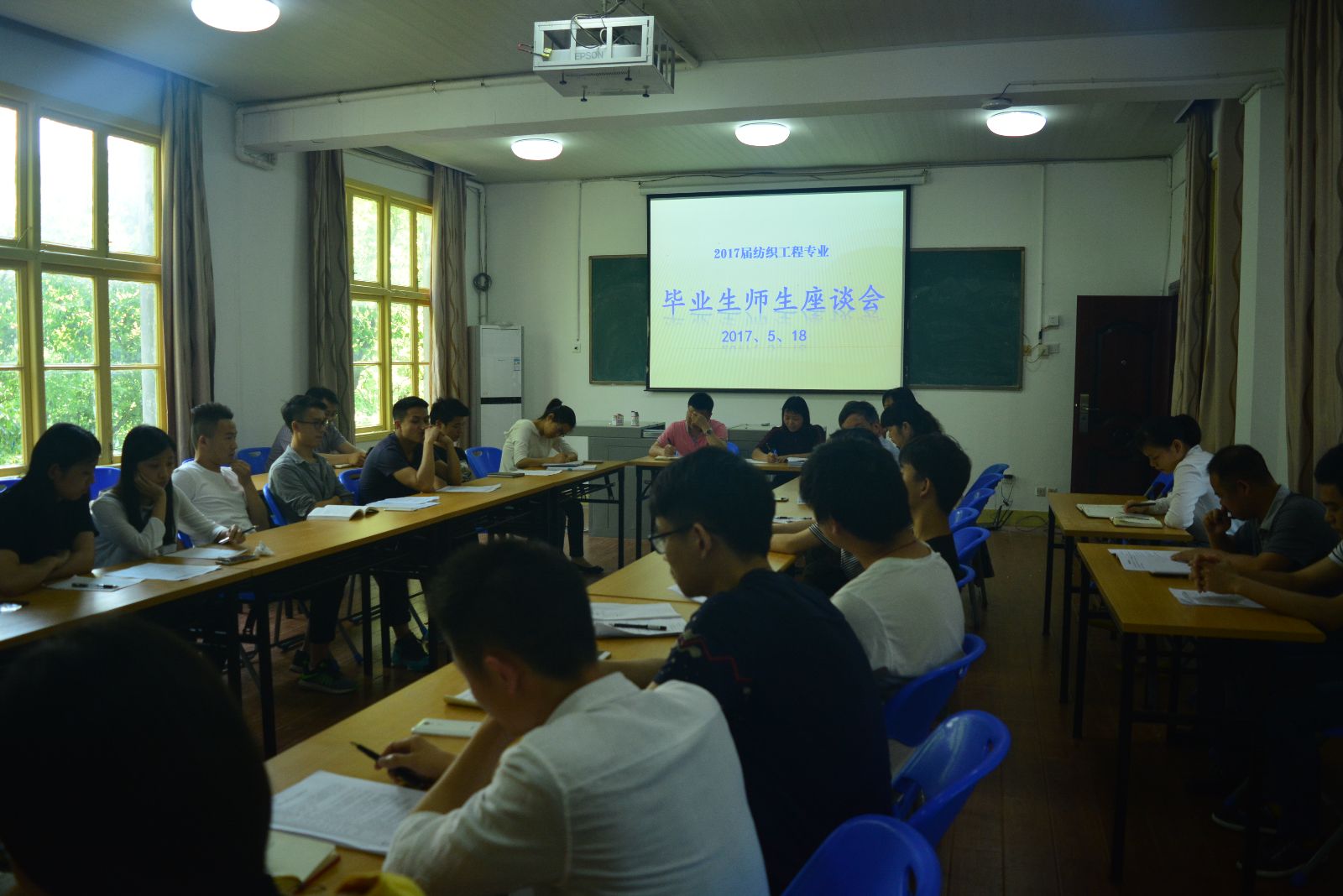 2017年5月18日15:00,402永利集团在电教303室召开2017届纺织工程专业毕业生座谈会,公司党总支书记江灏、副经理周衡书、副经理陈晓玲和副书记黄自力都出席会议,纺织工程专业20名毕业生代表和纺织工程专业教研室主任及骨干教师参加了会议。会议由周衡书主持。