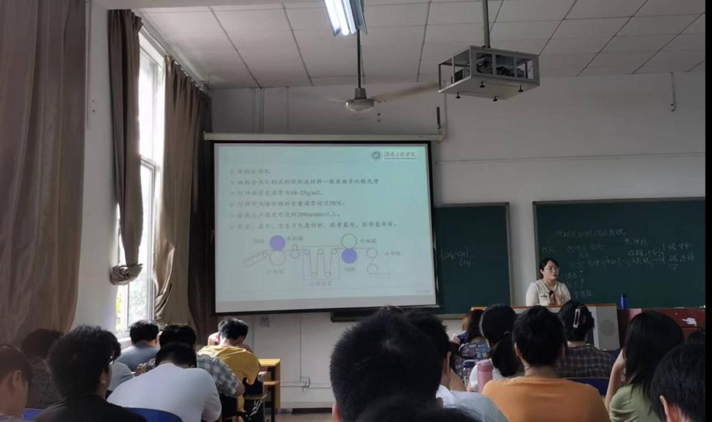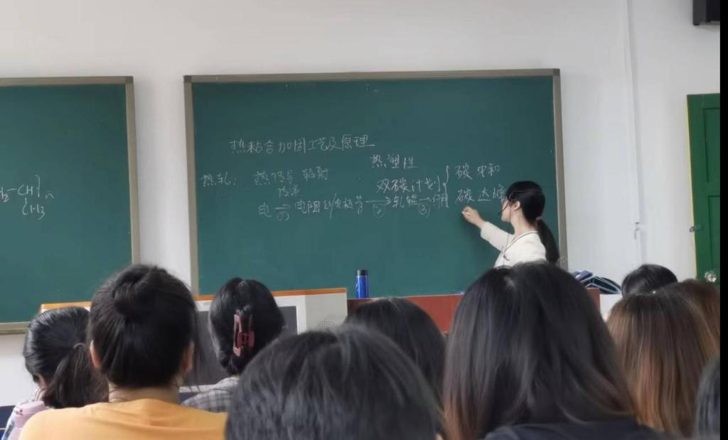 课程以热粘合加固原理与工艺为主线,围绕热轧粘合原理和方式来展开。以热轧粘合中使用具有热塑性的高聚物为纤网原料,通过加热加压的方式,使纤网熔融固化,达到取代传统化学粘合剂的效果,能耗仅为化学粘合的1/3-1/5,降低了产品的能耗。罗凤香老师深入挖掘课程思政元素,将热粘合加固过程中的节能减排方式和清洁生产效果与我国实现“双碳计划”的“碳达峰”和“碳中和”目标相结合,有效将绿色环保的理念根植于员工的心中,鼓励同学们为将来行业的 “清洁绿色”发展方向贡献力量,达到润物无声的育人效果。
