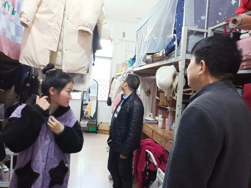 在员工宿舍,周衡书、李爱国检查同学们生活电器的使用情况,提醒同学们自觉遵守宿舍管理规定,提高消防安全意识,及时关闭插座电源。同时注意网络安全,提高“防电诈”意识。每到一间宿舍,周衡书、李爱国为宿舍同学提前送去新年祝福,同学们也祝老师元旦快乐、工作顺利。