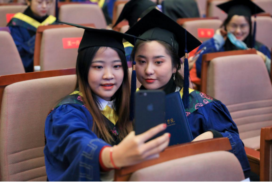 老师为员工整理学位服,同学互相拍照定格青春瞬间,是这场典礼最温情的画面。依依不舍话离别,肩负使命奔向前。悠扬的校歌声中,2020届毕业生的硕士学习生涯画上了一个完美的句号。从今天开始,他们也将奔赴一个崭新的人生起点。