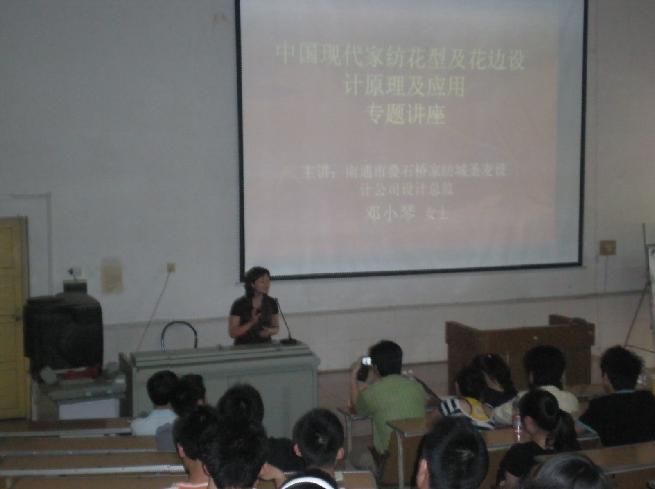 中午13:30,邓小琴女士受邀在电教105开展了一场题为“中国现代家纺花型和花边设计原理及应用”的讲座,听讲者云集电教楼。邓小琴女士作为97届的学姐,亲切而活泼,现场气氛极其融洽。邓女士和学弟学妹们一同分享了她的一些经历,讲到自己作为一个服装设计专业毕业的员工加入到家纺设计这个行业的经历。如今她已经涉足这个行业九年了,自己也已经深深地喜欢上了这个行业。邓女士结合自己9年的经历就有关家纺设计工艺要求、设计元素、花型花边作了详细的介绍。她还提到,目前还没有专门的家纺设计专业,在中国人才市场上具有极大的潜力空间。她表示学弟学妹有这方面意向的都可以找她提供力所能及的帮助。