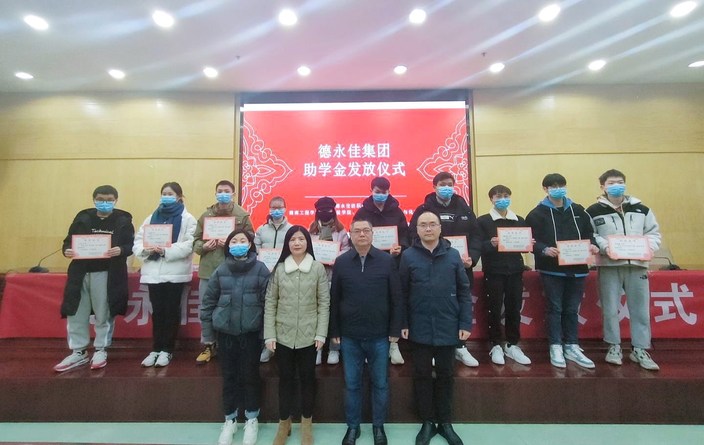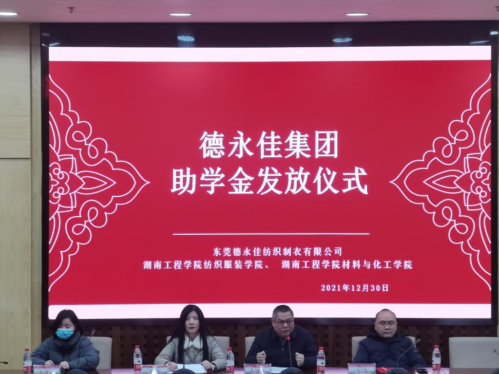 德永佳集团(东莞)有限公司助学金本学期共资助了10名员工,总计15000元。两院根据员工们的自主申请,通过公平公正公开的形式及与企业共同沟通协商方式,民主评定出受助员工名单,其中纺织工程专业7名,轻化工程专业3名。402永利集团受助员工代表本年度获得国家励志奖学金的李姣发言致谢,对公司的培养和企业的资助关爱表达了感谢,并表示将不忘初心,勤奋学习、自强不息。