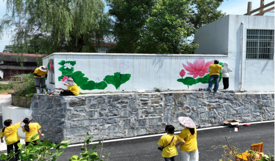 活动当日,团队成员顶着炎炎烈日,分工协作完成构图、调色、绘画等环节。墙绘内容融合当地生态特色与乡村振兴主题,生动展现农耕文化、田园风光及时代新风尚。绿意盎然的山水背景与色彩明快的墙绘相映成辉,昔日单调的村部墙面焕然一新,吸引村民驻足称赞。