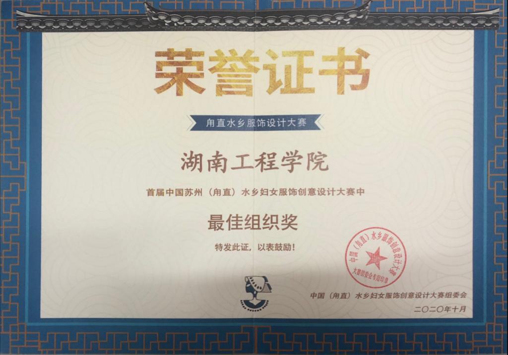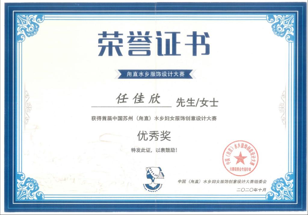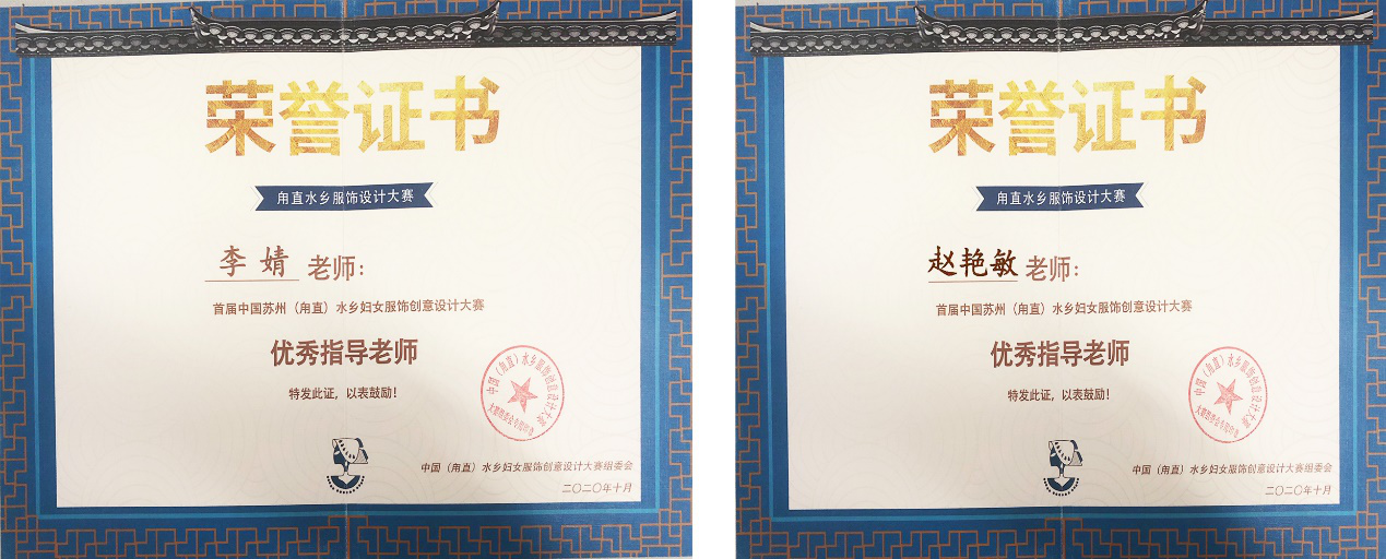 2020年10月10日下午,由苏州市吴中区甪直镇人民政府、苏州大学艺术研究院主办的首届中国苏州甪直水乡妇女服饰创意设计大赛评选结果正式出炉,公司18级员工任佳欣同学作品《温语》获得“优秀奖”,指导老师李婧、赵艳敏获得“优秀指导老师”,402永利集团获得“最佳组织奖”。