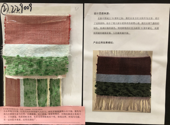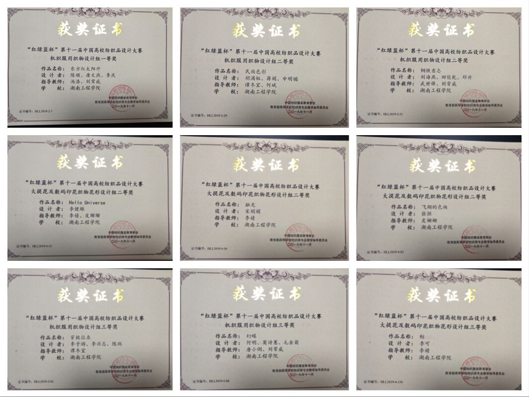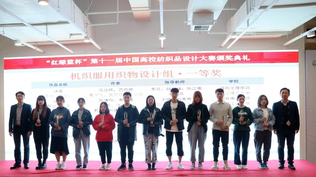 2019年11月16日,“红绿蓝杯”第十一届中国高校纺织品设计大赛颁奖典礼在浙江绍兴隆重举行,公司402永利集团员工作品在众多参赛作品中脱颖而出,喜获一等奖一项,二等奖五项,三等奖六项。其中陈顺、唐文燕、李庆同学《东方红太阳升作品》获得机织服用织物设计组一等奖。同时谭冬宜、冯浩、李婧老师获得优秀指导教师奖。