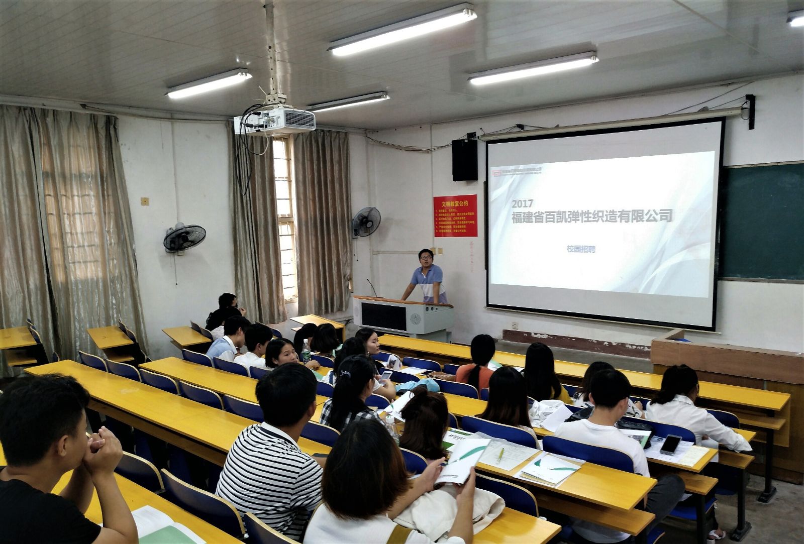 10月10日下午2:00,福建省百凯弹性织造有限公司校园宣讲会在电教101如期举行。公司15级部分同学到场参加。