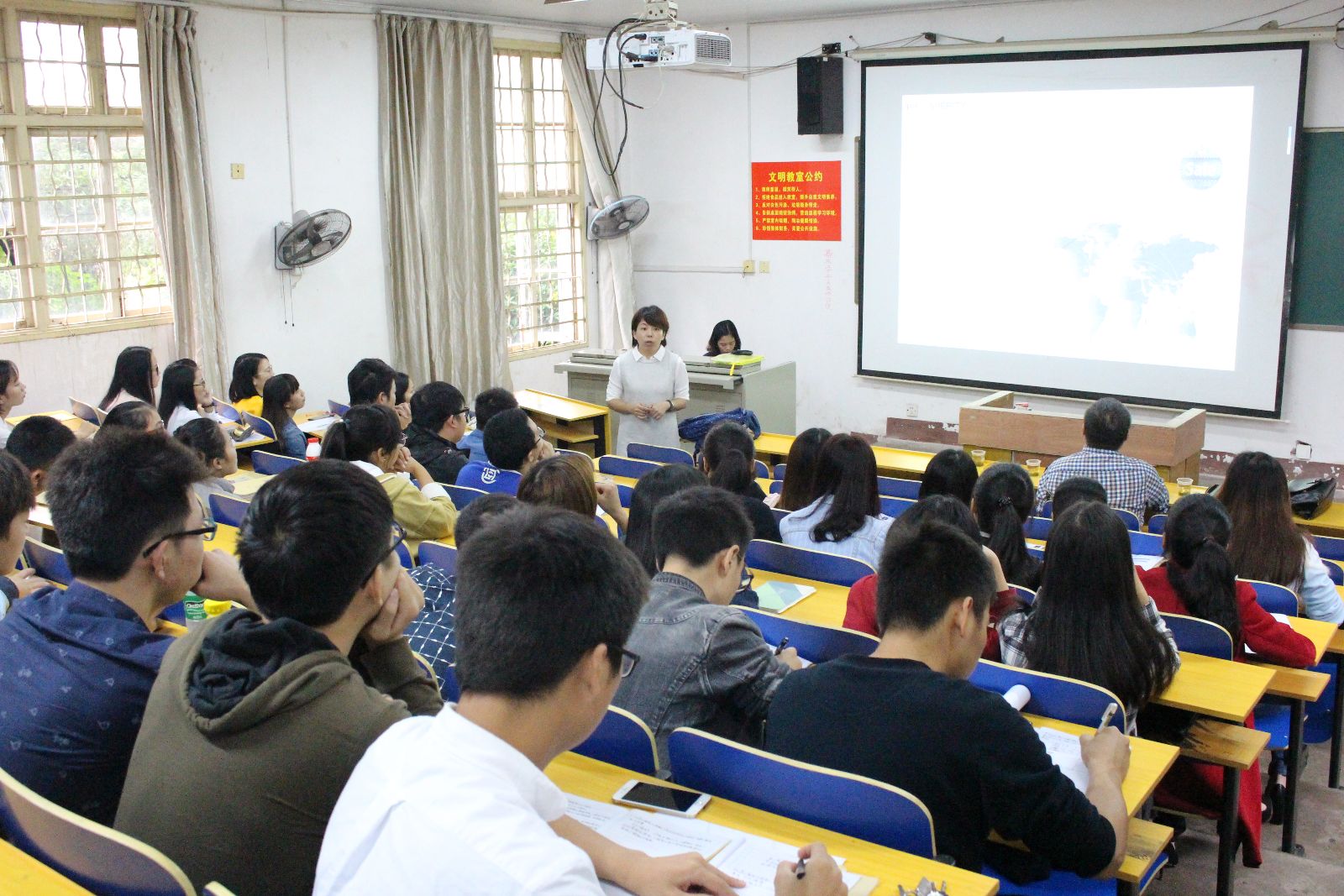 宣讲会由北江公司人力资源部负责人主讲。大会伊始,主讲人通过PPT简要介绍了北江公司的创始时间、公司规模、关于我们以及发展历程,主讲人重点指出:北江纺织是一家快速成长的国际化纺织公司,为全球客户提供研发、设计和制造的一站式牛仔面料采购服务;公司每年参与全球10余个国家的面料展会,现与超过50家国内外主流的牛仔品牌和零售公司保持紧密合作。使在场员工对北江公司的成长历史和经济实力有了一定的了解。随后,主讲人向在场同学简述了关于该公司的愿景与使命:一、将通过面料开发、包装推广以及订货会联合等方式开展与国内时尚品牌的深度合作;二、全面走出去,在多个国家自建面料生产基地;三、在五年内做到该行业亚洲第一,世界领先。其字里行间流露出的信心与热情,赢得了现场热烈的掌声。最后,公司负责人向大家介绍北江纺织所需招聘岗位和应聘要求,并诚挚希望有意愿的员工与其公司相互深入了解。