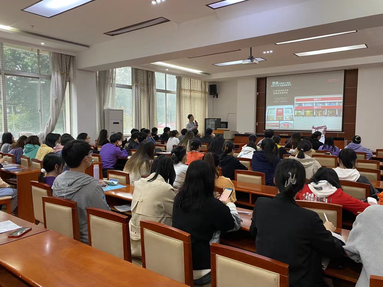 接着,主讲人详细介绍了公司的各个方面:背景、规模、人才引进计划、发展体系等。同时也说明了日后进入公司后各阶段的班制问题和待遇问题。还向现场同学讲解了公司发展历程并展示了公司的主要产品,加深了同学们对梦洁的认识。
