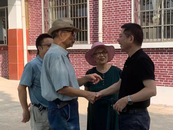 捐赠仪式后,刘清海与原湖南纺织高等专科公司董事长梁歧、班主任梁志斌老师、公司领导班子、教师代表进行交流。刘清海回忆了求学期间在校的难忘瞬间,表达了对公司和恩师的感谢和真切祝愿。临别之时,在校园的林荫小道上,刘清海轻挽着两位年迈的梁老师,依依不舍。“有时间,我一定会常回母校,再多看看恩师。”刘清海说道。