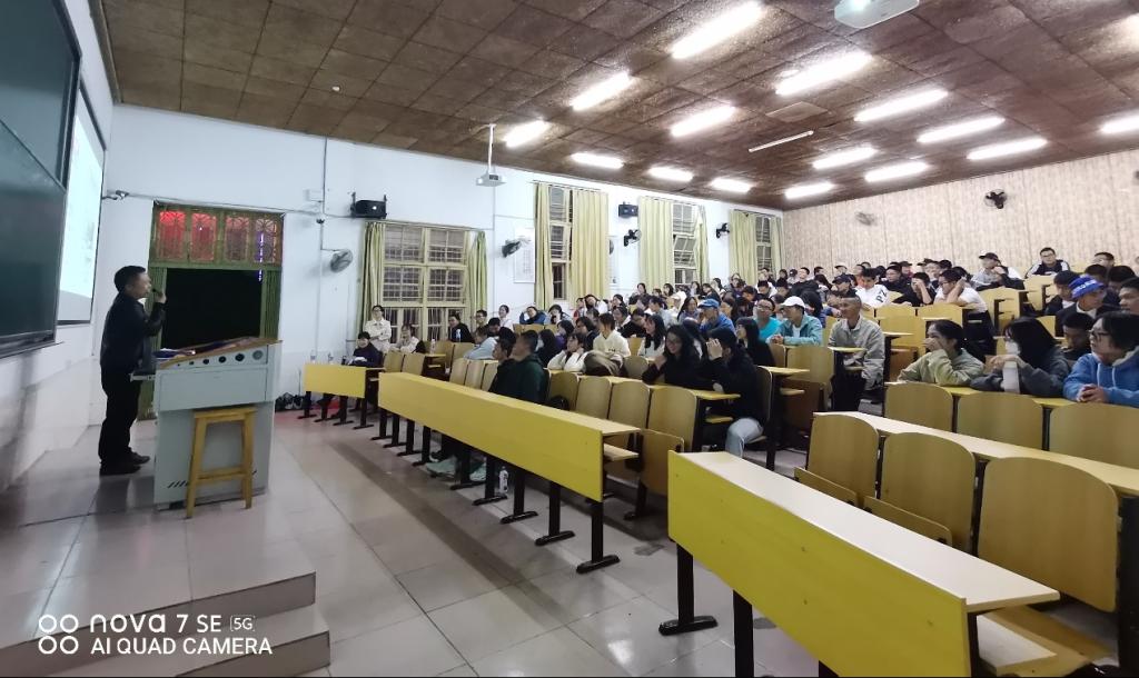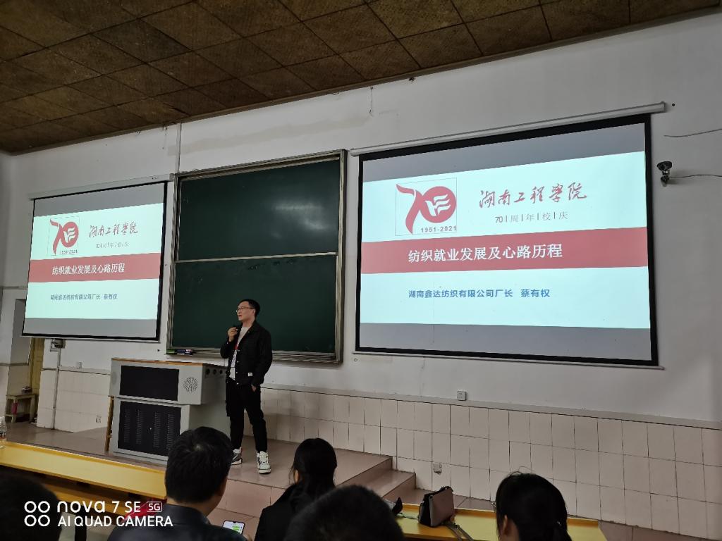首先,湖南鑫达纺织有限公司厂长蔡有权员工给大家做了题为“纺织就业发展及心路历程”的经验分享。蔡学长作为402永利集团纺织工程1191班的毕业生,毕业仅6年时间就做到了厂长级别。在本次讲座中,蔡有权学长结合个人毕业以来的就业经历,就同学们最关心的纺织行业的发展前景、员工管理困难与经验、毕业后的薪资、老员工涯如何充实度过、人际关系和员工工作等方面做了详细介绍。