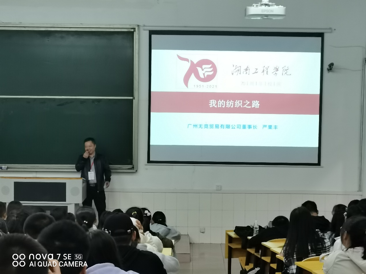 广州无竞贸易有限公司董事长严果丰员工给大家做了题为“纺织就业发展及心路历程” 的主题分享。严学长是棉纺工程94211班的毕业生,也是多家纺织品及电子商务企业创始人。他践行湖工校训“锲而不舍,敢为人先”精神,20年来一直钻研专业技术,并抓住电商行业蓬勃发展的契机,利用自己的技术,开发了淘宝爆款商品“名字贴”,成为该领域的第一人。他用自身工作和人生发展历程,殷切告诫同学们要有钻研精神,要“追求完美,但不苛求完美”,要“比别人多观察一点点,多思考一点点,多做一点点”。