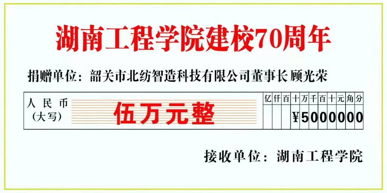 建校70周年之际,公司友好合作企业韶关市北纺智造科技有限公司董事长顾光荣向公司捐赠五万元,用于公司建设,助力公司发展。