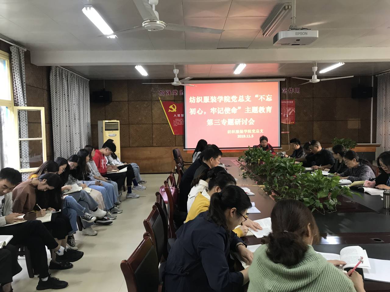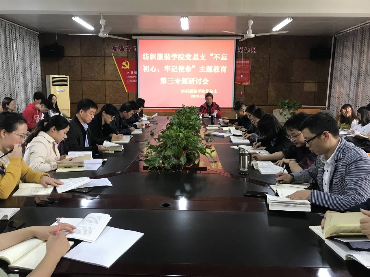 11月5日下午,纺织服装公司党支部在电教二楼会议室召开“不忘初心、牢记使命”第三专题研讨会。由几名同志领读学了《习近平关于“不忘初心、牢记使命”论述摘编》的第八章、第九章、第十章,部分党员就如何实践初心使命、做一名新时期有担当有作为的党员,交流了学习体会。