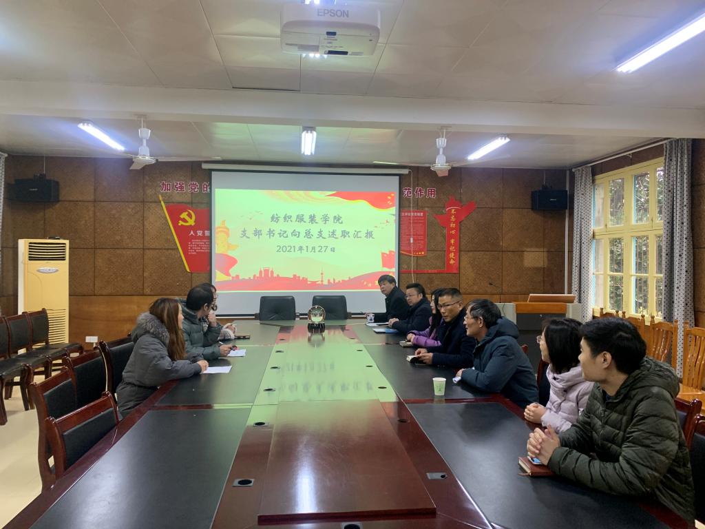 2021年1月27日下午,纺织服装公司党支部书记向党总支述职大会在电教201室举行,党总支书记李爱国、统战委员周衡书、保卫委员兼副书记罗荃、纪检委员吴湘渝、宣传委员张轶、青年委员刘超、组织员张建国、教工党支部书记何斌、员工第一党支部书记喻亦荣、员工第二党支部书记傅静琳出席会议,会议由党总支书记李爱国主持。