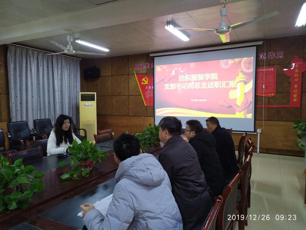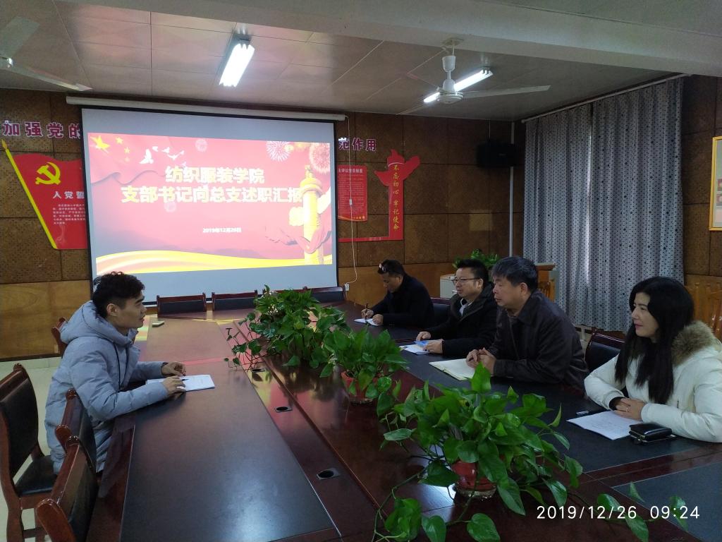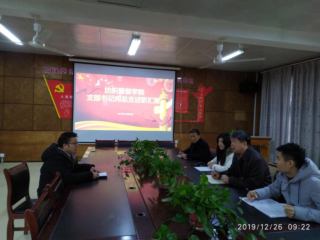 12月26日上午,纺织服装公司党支部书记向党总支述职大会在电教201室举行,党总支书记李爱国、统战委员兼纪检委员吴湘渝、教工党支部书记周衡书、员工第一党支部书记罗荃、员工第二党支部书记张轶出席会议。会议由党总支书记李爱国主持。