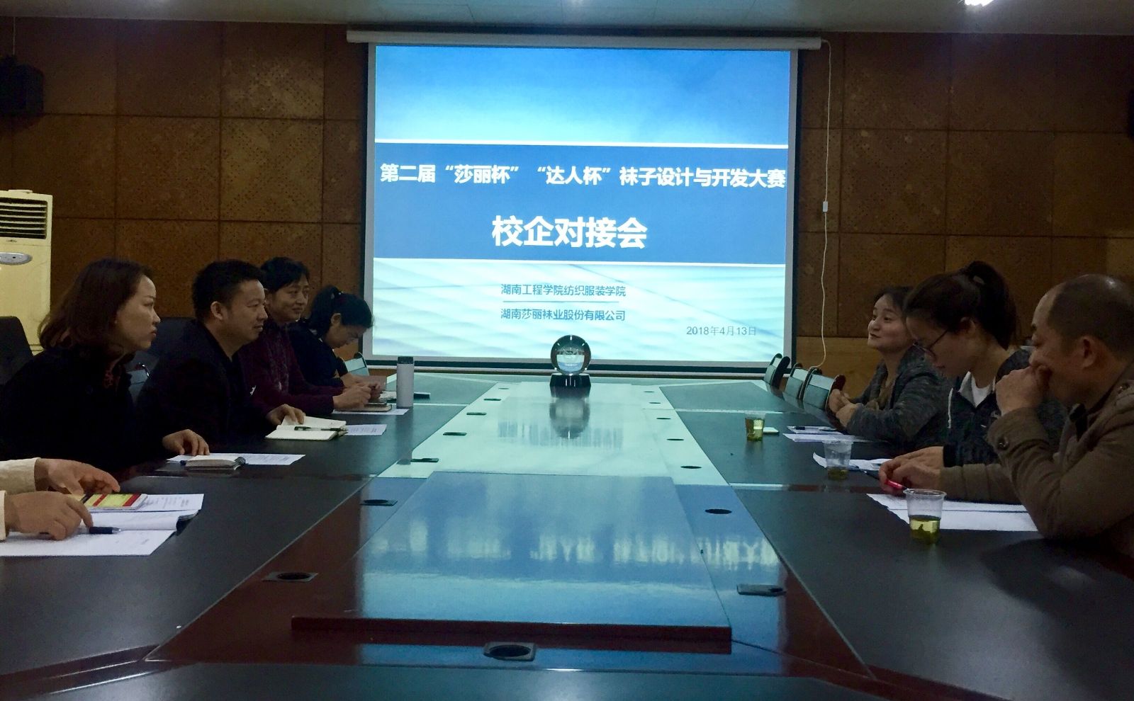 2018年4月13日上午,湖南莎丽袜业办公室主任汤静、设计部欧清松、钟虹等来到402永利集团就第二届“莎丽杯”“达人杯”袜子设计与开发大赛相关事宜进行交流和对接。公司党总支副书记黄自力、副经理周衡书、服装教研室主任左双喜等热情接待,并在电教楼二楼会议室召开校企合作对接座谈会,会议由周衡书主持。湖南莎丽办公室主任结合企业自身需求,就本次合作方案和要求做了相关介绍:本届大赛主要以“民族服配民族袜”、“运动服配运动袜”、“一袜一故事”为主线,深度挖掘民族文化,在满足袜品制造生态、舒适健康的基础上,实现民族服配民族袜,民族袜传播中华民族故事的终极目标;对使用纱线上也提出了相应的要求,更贴合企业需求和市场。