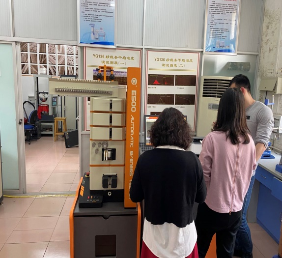 条干均匀度测试仪是公司新购进的仪器,该仪器可以用于测试分析条子和粗纱的条干线密度不匀的结构特征。本次培训,工程师主要围绕条干均匀度测试仪的结构,数据计算,监控软件平台操作,查阅CV %值、波谱图、变异——长度曲线,线密度频率分布图等内容进行讲解。最后通过实际操作、现场展示的方式为参训人员详细介绍了条干均匀度测试仪的使用方法。