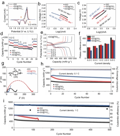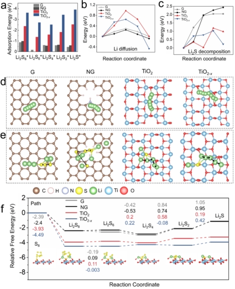 多硫化物(LiPSs)的穿梭效应和缓慢的转化动力学导致锂硫电池(LSBs)的循环性能差和能量效率低。在这项工作中,通过表面活性剂导向的水热生长,在多巴胺保护的热解下合成了一种分层结构的纳米复合材料,作为LSB的双向催化剂。该纳米复合材料由N掺杂的还原氧化石墨烯(rGO)纳米片通过界面N-Ti和C-Ti键固定在均匀分布的TiO2-x纳米颗粒上,从而形成丰富的2D/0D肖特基异质结(rGO/TiO2-x)。密度泛函理论(DFT)计算和原位拉曼表征表明,rGO/TiO2-x有效抑制了LiPSs的穿梭,增强了氧化还原动力学,实现了硫阴极的高利用率,提高了电池的整体可逆性。在高硫负荷和低电解质/硫比下获得高面积容量。在电流密度为0.2C (1C = 1675 mA· g−1)时,初始比容量达到1010 mA h·g−1,在100次循环中,比容量保留率达到86.4 %。