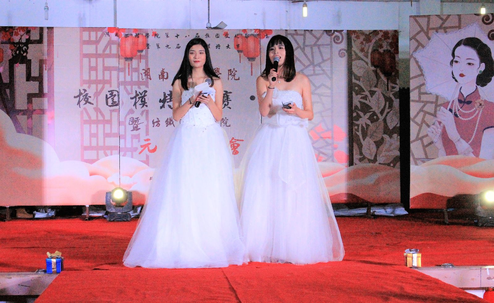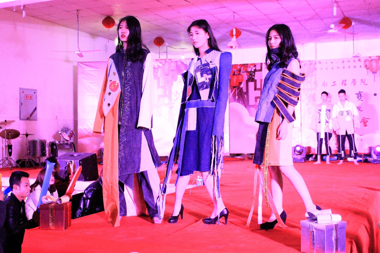 “东湖路128号乐队”的演奏与倾情演唱迎来了模特的第三轮走秀《模特礼服展示》。走秀服装别出心裁,包括婚纱、礼服、西装等成品,全部来自服设1501、1502本学期课程作业,指导老师皮珊珊通过模特的展示为每套服装进行现场点评、打分,并最终评出“最佳设计奖”。