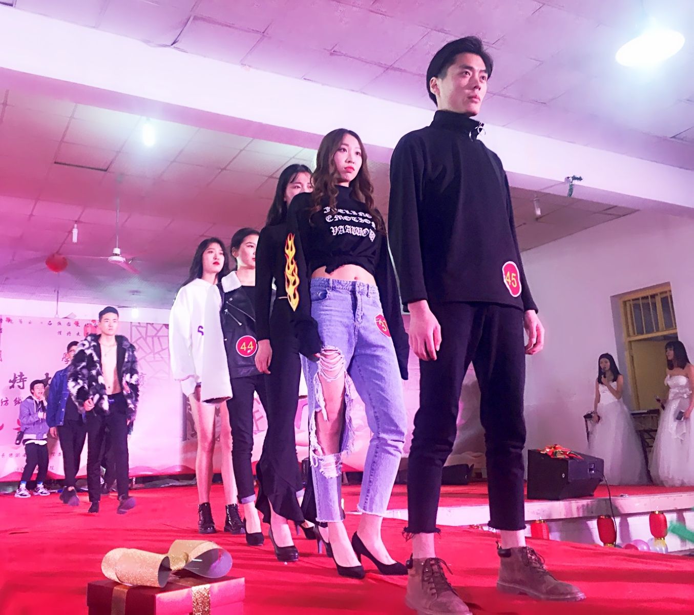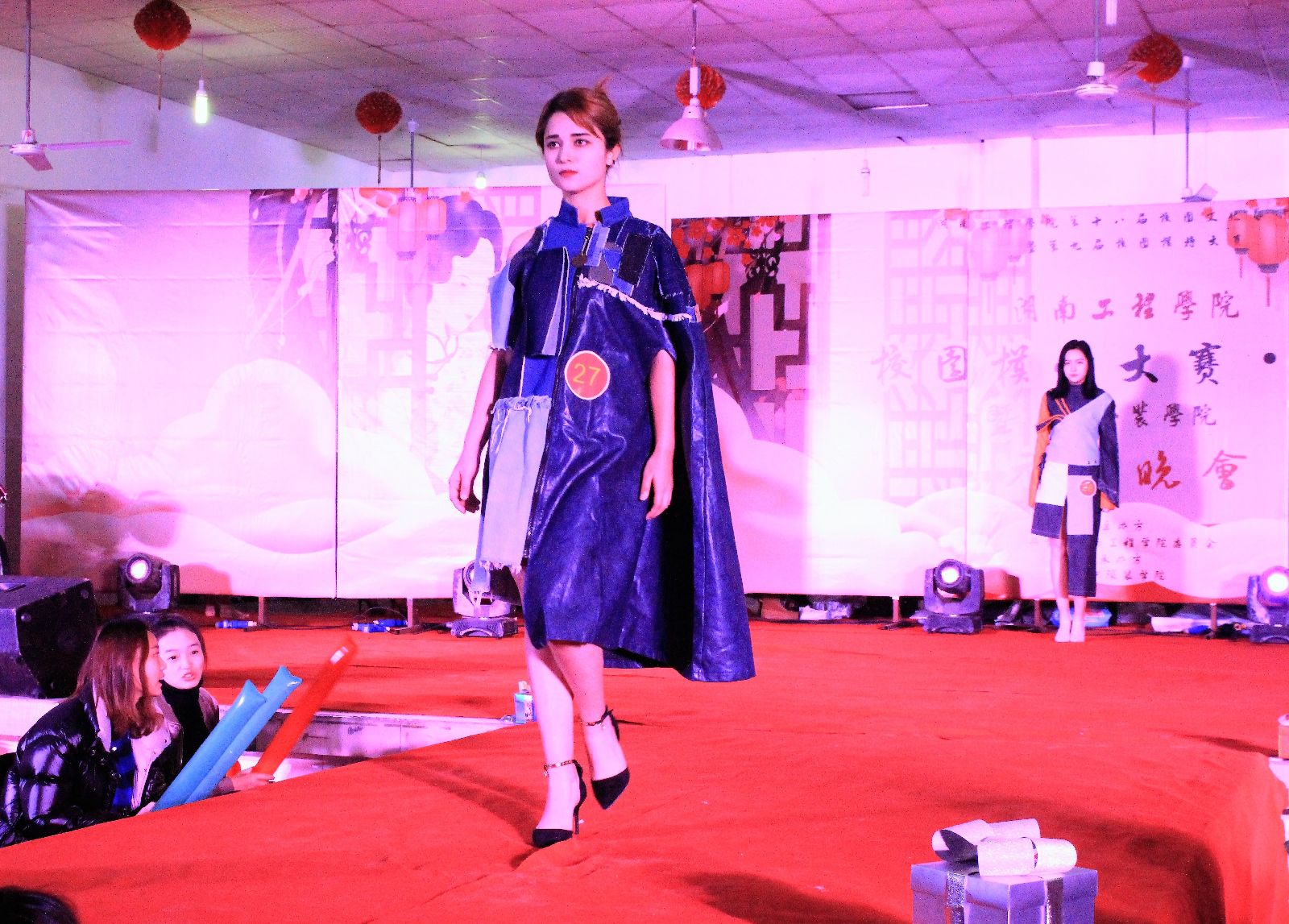 随后,模特第二轮展示《我的时尚校园生活》接踵而至。走秀采取了《维多利亚的秘密时尚内衣秀》的展示方式,将说唱与T台展示完美结合,以说唱者的随性、灵活迎接每位步入红地毯展示的校园模特,让观众在视觉、听觉上得到双重享受,仿佛来到了“维密现场”。