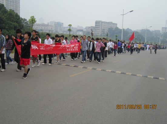 早上8点整,402永利集团员工党员组织大一新生在学海花园集合完毕,公司员工第一党支部书记、学办主任唐星星宣布活动正式开始,晨跑队伍带着“低碳生活 从我做起”的宣传横幅出发,经新北高速,到达新校区时,不少外院员工为表示对低碳校园生活的支持,也自觉参与到宣传队伍中来。相信这越来越壮观的队伍,证明低碳校园生活理念正得到广泛的认可与践行。